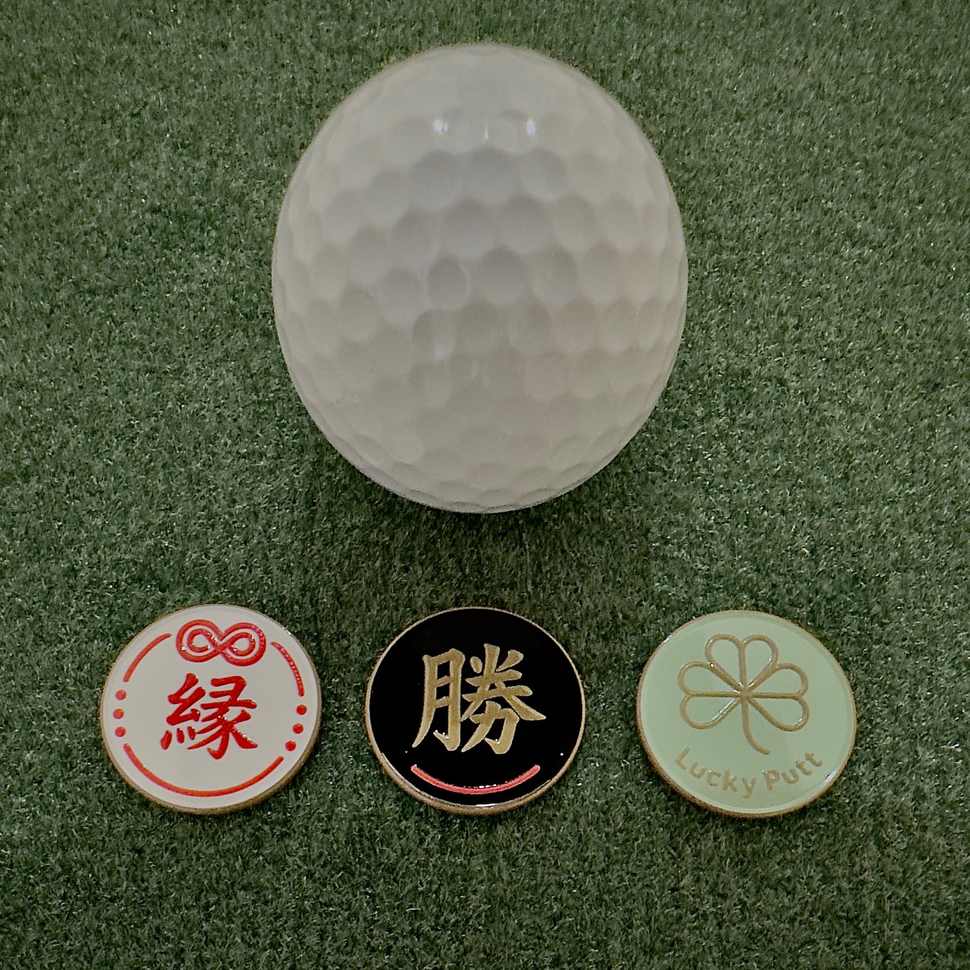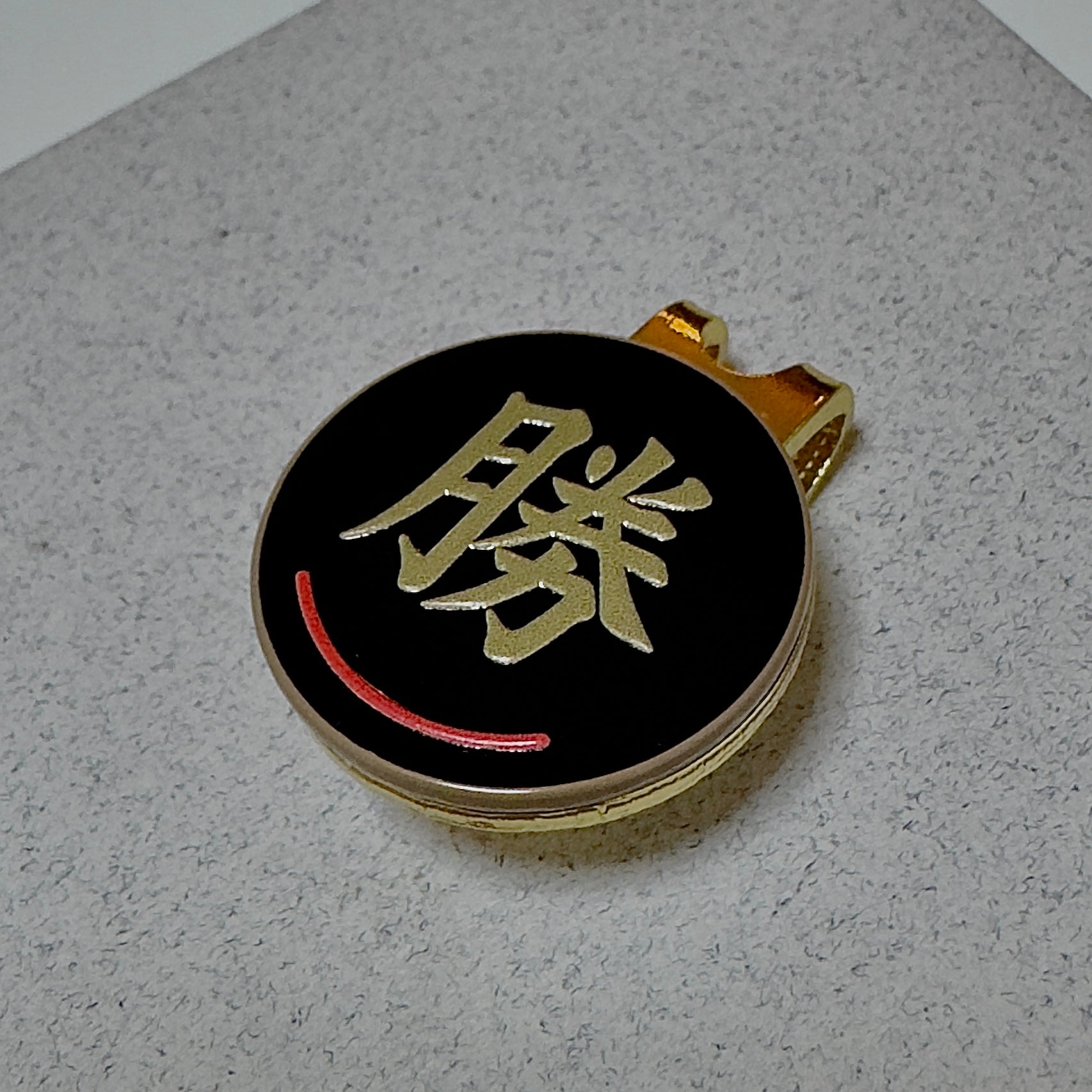 ゴルフは技術と精神力のスポーツ。そして最後に決めるのは“運”。このマーカーは、勝利の象徴である『勝』の筆文字をゴールドで刻み、赤いラインで強運を呼び込みます。